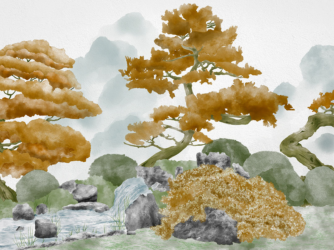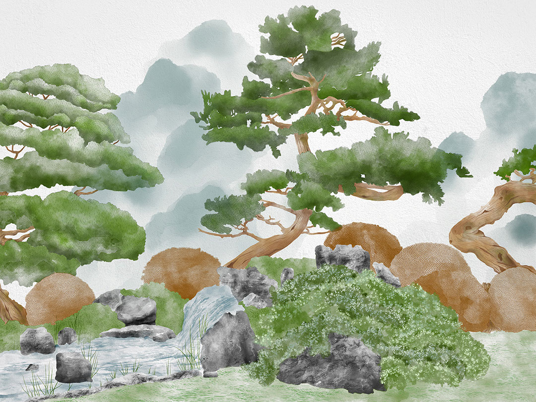 Papier peint d’une forêt gris-bleu dans le brouillard