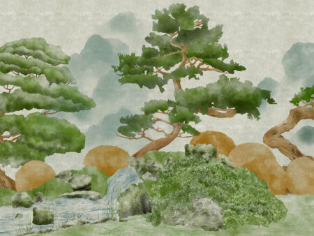 Fresque murale détaillée d’une forêt gravée dans des couleurs vertes brumeuses
