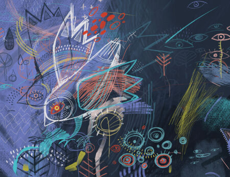 Fresque murale abstraite sombre de fleurs et d’oiseaux naïfs