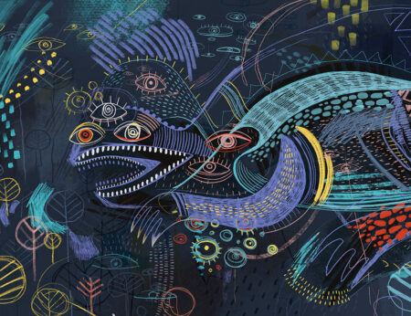 Créature fantastique abstraite foncée inspirée par la peinture murale de Maria Prymachenko