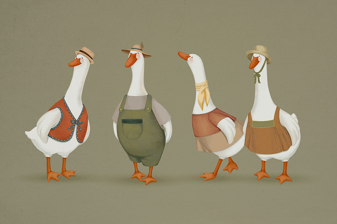 Voici Goosery, un quatuor d’oies chic-campagne qui ont emprunté la garde-robe de la ferme : gilet piqué pour l’une, salopette olive pour l’autre, tabliers, foulards et canotiers de paille inclinés pour les comparses. Le fond kaki met en valeur leurs becs orange carotte et les accents rouille, sauge et miel des tenues. Une ombre discrète sous leurs pattes ajoute du relief, comme si elles attendaient le début d’une danse de grange. Installez Goosery dans une chambre d’enfant, une salle de jeux ou une cuisine rustique pour déclencher sourires et histoires ; complétez par paniers tressés, coussins vichy et bois blanchi pour un charme cottage authentique.