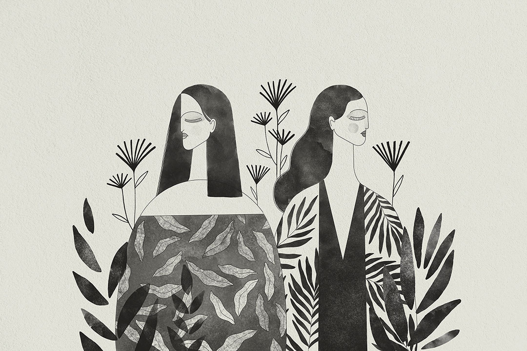 La fresque Sisterhood met en scène deux femmes épurées. Leurs silhouettes monochromes sont remplies de feuillages et de palmes en lavis d’encre, évoquant un jardin intérieur. Le trait fin esquisse des paupières closes, tandis que le papier texturé apporte chaleur et profondeur. La palette noir-gris s’accorde aux canapés neutres, aux buffets en chêne et aux touches de laiton. Installez-la au-dessus d’une console pour créer une entrée façon galerie, dans un dressing pour une note éditoriale ou sur le mur d’un café boutique pour une élégance feutrée.
