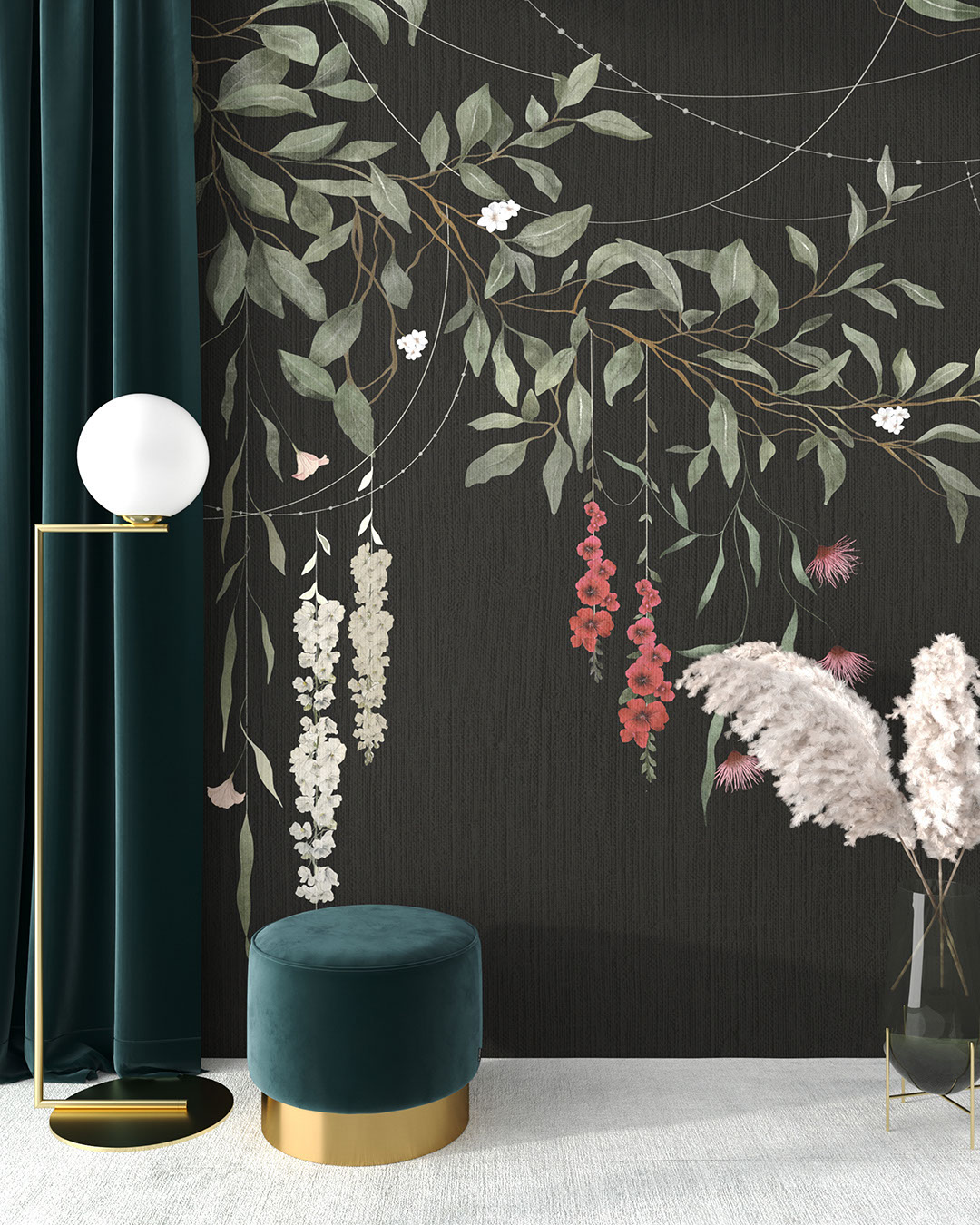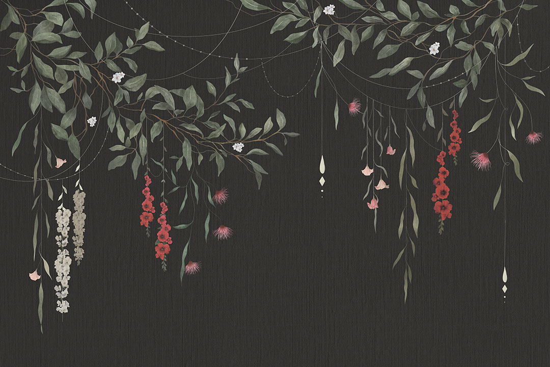 La fresque Nocturna enveloppe la pièce d’une ambiance de jardin au clair de lune. Des branches d’eucalyptus traversent un fond noir velours; entre les feuilles descendent des grappes d’hélianthes rouges, de clochettes roses et de fleurs crème. De fines courbes argentées suggèrent des guirlandes lumineuses, pour une lueur discrète. Deux variantes plus douces existent — l’une sur blanc chaud, l’autre sur beige — pour ceux qui souhaitent plus de clarté. Nocturna s’accorde aux fauteuils en velours, appliques en laiton brossé et céramiques mates, ou encore à un parquet en chêne et des voilages de lin. Dans une salle à manger elle encadre un dîner aux chandelles, dans une chambre elle fait office de tête de lit végétale, dans le hall d’un boutique-hôtel elle métamorphose le mur en serre nocturne.