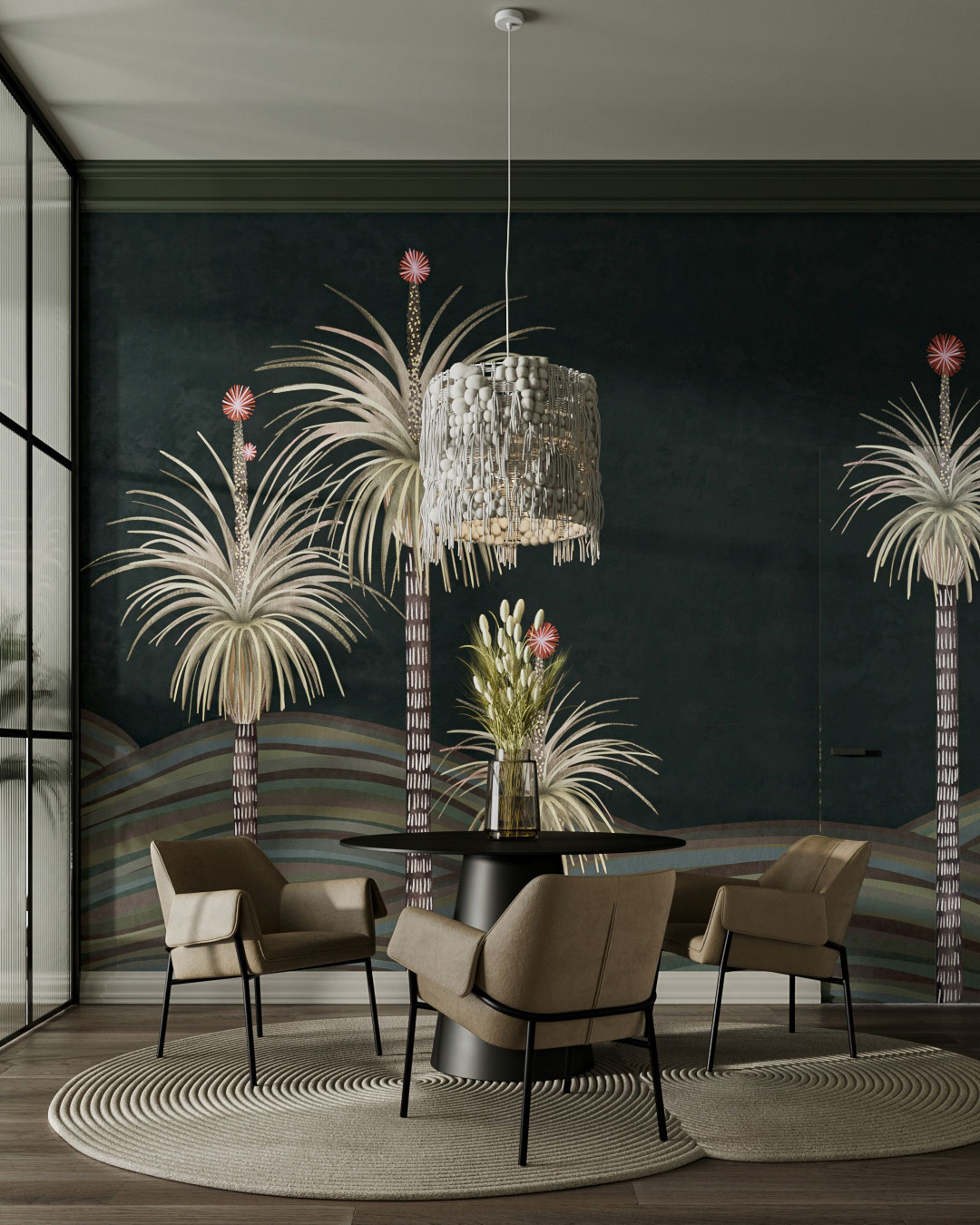 Astria dresse un bosquet de palmiers oniriques sous un ciel nuit vert-pétrole. Les troncs élancés, marqués d’entailles ivoire, portent des couronnes en feu d’artifice surmontées d’une fleur corail qui luit telle une étoile. Des collines ondulées, mêlant verts sourds et bruns cacao, ancrent la scène et suggèrent un rythme discret. Associez Astria à un buffet en noyer, des appliques en lin et un canapé bas en bouclé pour un salon tropical chic, ou bien à du métal noir mat et une table basse en terrazzo pour un esprit loft. Dans une chambre, il devient tête de lit poétique ; dans un couloir, il allonge la perspective ; dans un bar, il transforme la pénombre en ciel constellé.