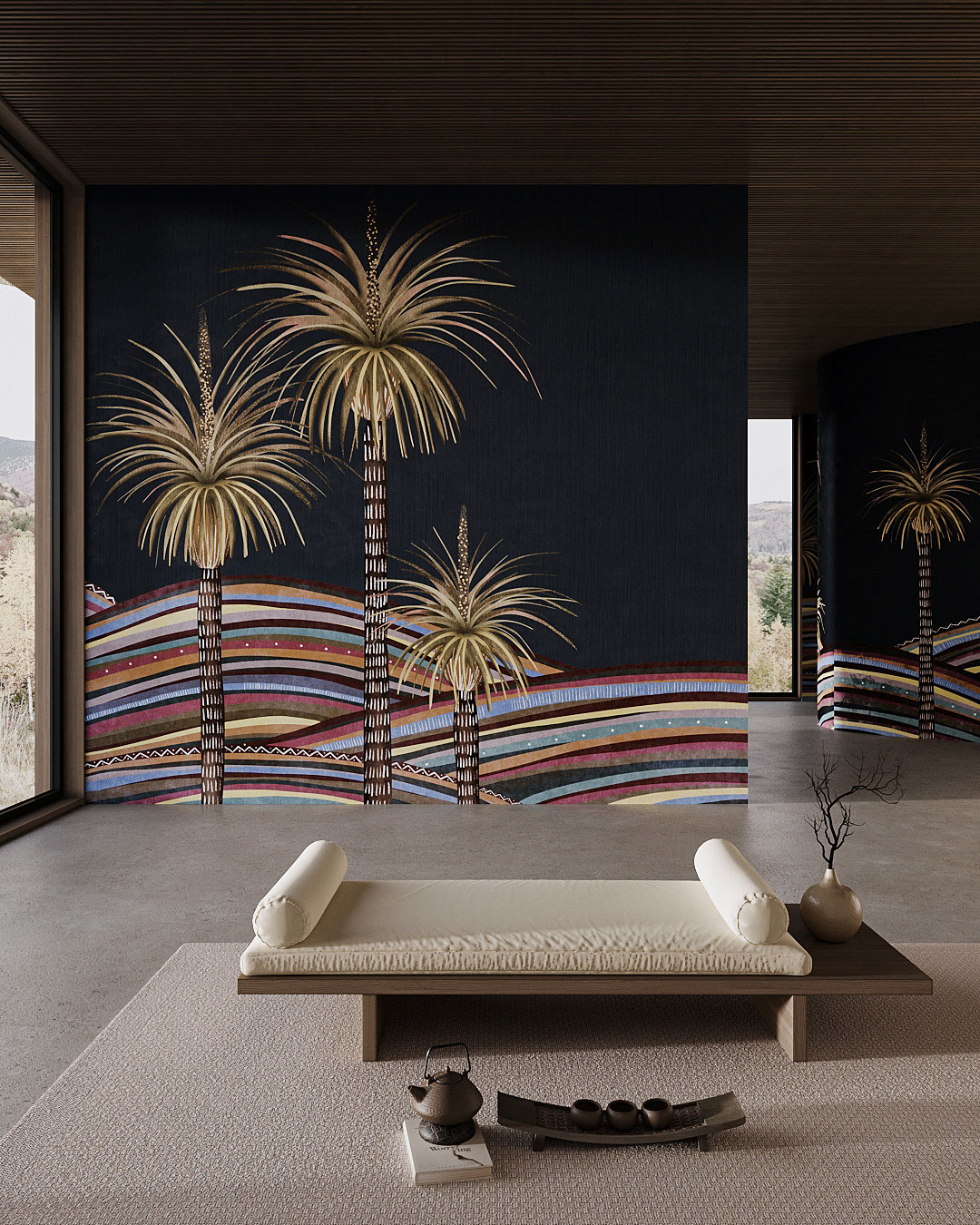 Cobalto fait d’un mur une fête nocturne dans le désert. Des troncs élancés marqués d’entailles ivoire s’élèvent de dunes ondulantes, rayées de rouille, d’ocre, de sarcelle et de prune; des points de couleur évoquent des feux de camp au loin. Le ciel marine reste vierge, prêt à accueillir une étagère, un tableau ou simplement le vide. Associez Cobalto à un buffet en noyer, un canapé bas en bouclé et une lampe arc en laiton pour un salon façon boutique-hôtel, ou optez pour des suspensions en rotin et des coussins indigo pour un esprit plus bohème. Dans une salle à manger il encadre des dîners qui s’éternisent, dans une chambre d’enfant il devient décor de conte, dans un couloir il ouvre l’horizon.
