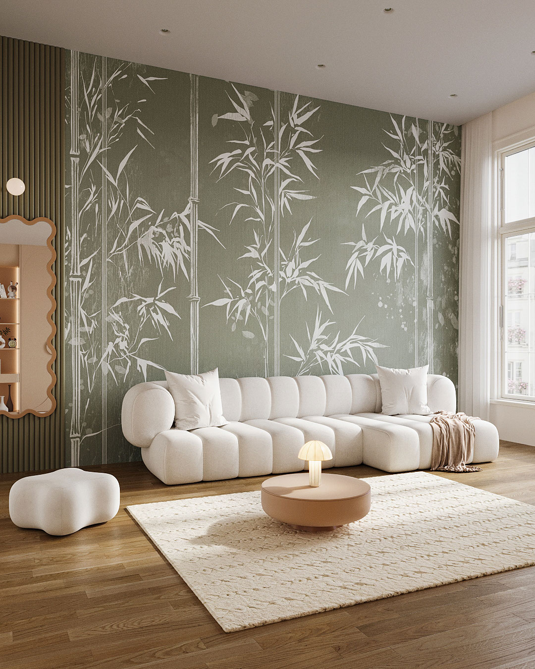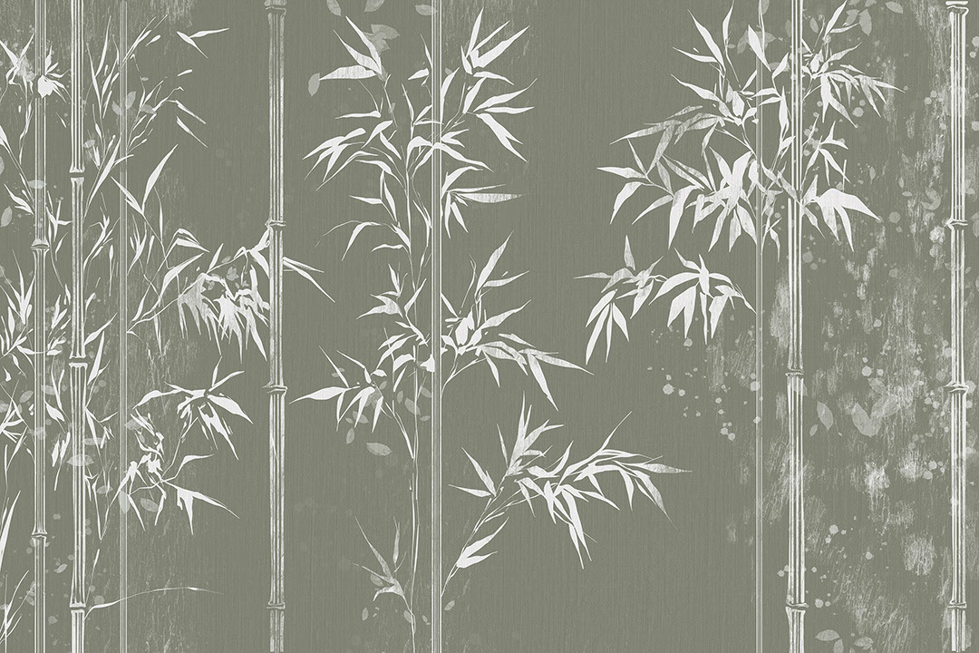 Bambusa évoque un bosquet de bambous paisible sur une toile vert sauge brumeuse. Tiges élancées, légèrement ombrées à chaque nœud, et feuilles blanches découpées en négatif composent la scène. Des touches de pinceau sec estompent le fond, rappelant un lavis d’encre sumi sur papier washi. La palette sourde se marie au chêne brut, aux poteries artisanales et au cannage, mais adopte un twist contemporain avec des appliques noir mat et un cache-pot cannelé en béton. Derrière un lit plate-forme Bambusa instaure un calme de spa ; dans des toilettes d’invités, il élève quelques mètres carrés ; dans un couloir, il transforme la marche en promenade zen.