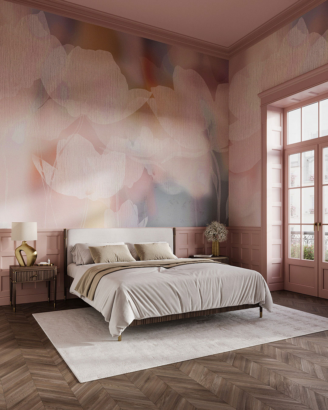 Whisper fond un champ de coquelicots dans un voile de douceur pastel. Les pétales s’évaporent en nuages rose poudré, pêche et gris colombe, tandis que de subtils tracés blancs glissent sur le grain d’un lin raffiné. La palette vaporeuse s’accorde au chêne blanchi, aux appliques laiton brossé et à la bouclette, mais trouve aussi un équilibre avec des cadres noirs et une table basse en travertin. Derrière un lit, Whisper devient tête de lit aérienne ; dans une salle de bains spa, il apporte un calme immédiat ; dans un coin repas, il adoucit les discussions qui se prolongent.