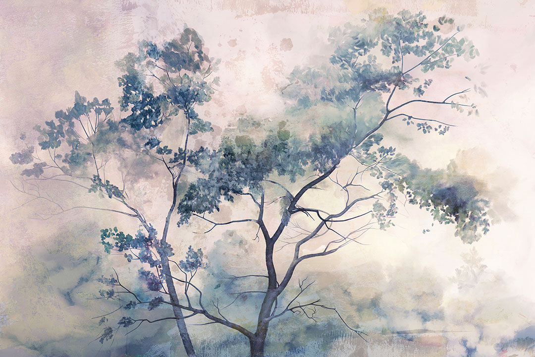 Celina capture l’instant où la première lueur caresse la canopée. Des lavis aquarellés rose poudré, lavande et aqua brumeux se fondent, tandis que des branches fines à l’encre tracent des arcs élégants dans la brume. Un léger grain et quelques éclaboussures donnent au fond la texture d’un papier superposé. Associez Celina à un parquet en chêne clair, un fauteuil bouclé et des appliques en verre dépoli pour une ambiance spa, ou contrastez-la avec des ferrures noir mat et un buffet en chêne fumé pour plus de relief. Derrière un lit, la fresque devient une tête de lit aérienne ; dans un coin lecture, elle apaise le regard ; dans un couloir, elle guide le pas comme un sentier forestier à l’aube.