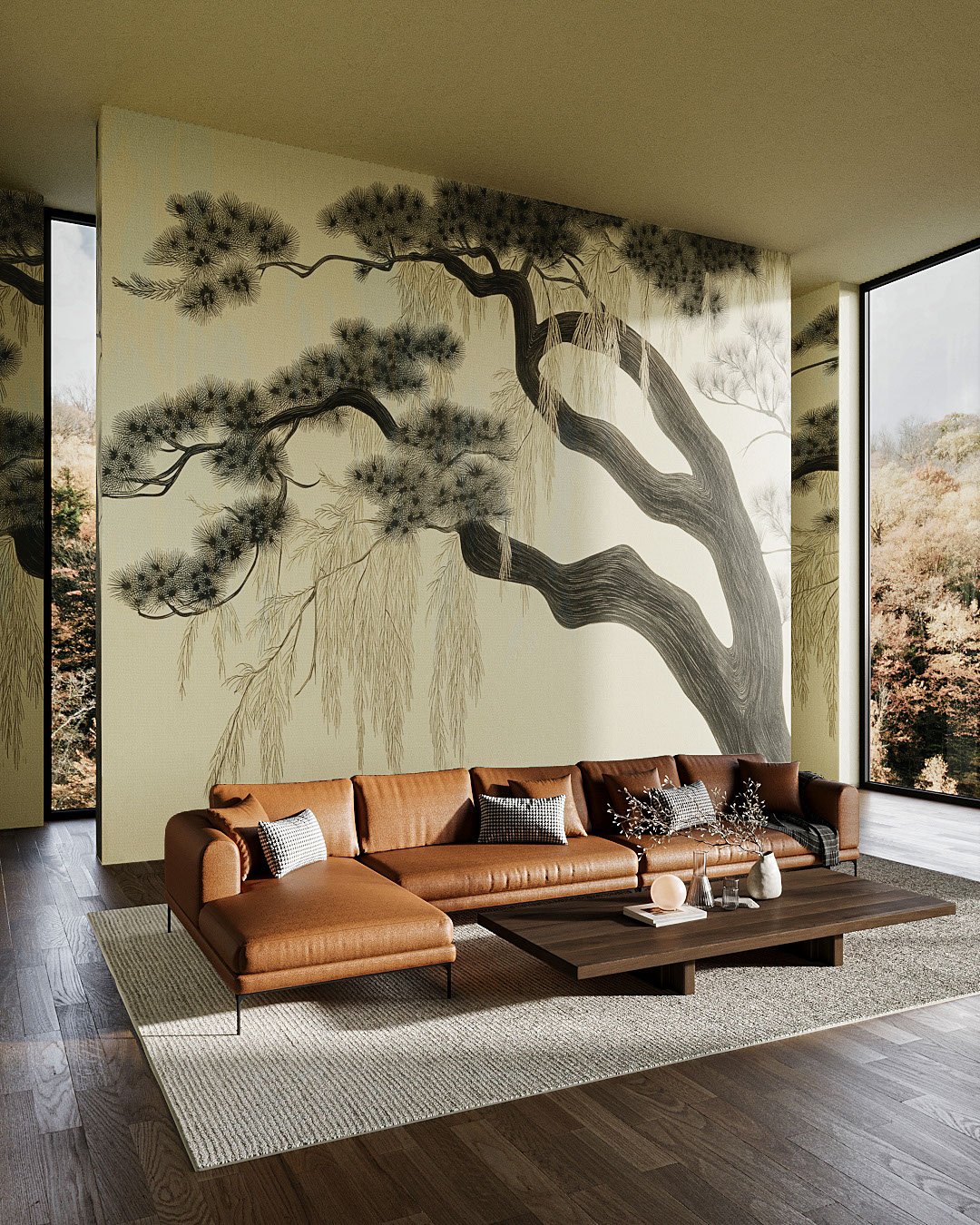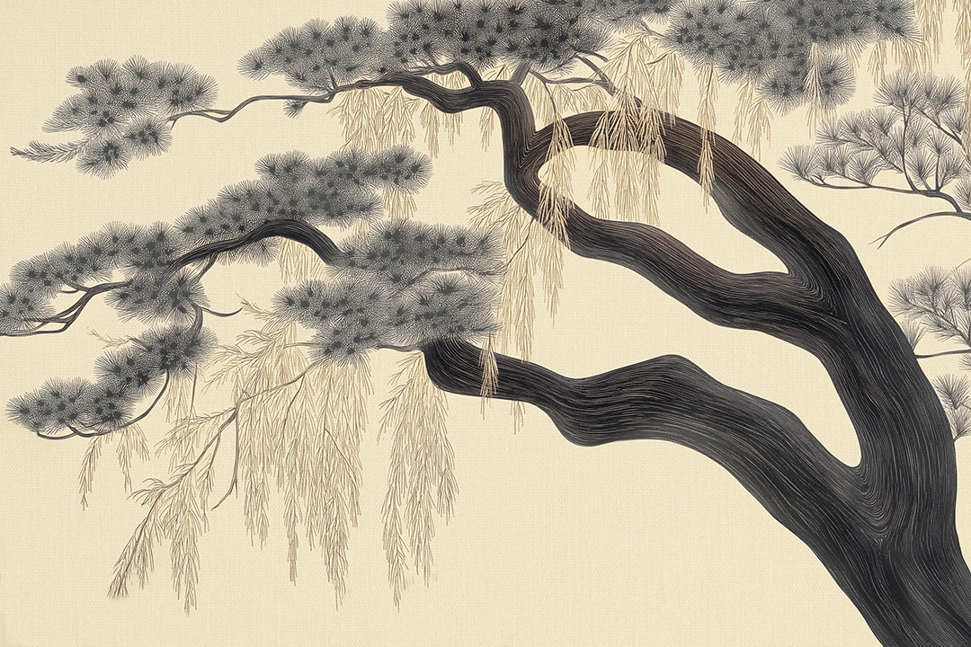 Yugen restitue le théâtre silencieux d’un pin séculaire, tracé en sumi-e avec une précision calligraphique. Le tronc d’ébène serpente sur un ivoire chaleureux, tandis que les bouquets d’aiguilles et les houppes pendantes se dissipent en fines ponctuations d’encre. Le grain du papier, perceptible sous le pigment, offre une matérialité artisanale. Associez Yugen à un tatami en chêne clair, des coussins de lin et une lampe shōji pour une sérénité zen, ou opposez ses courbes organiques à du métal noir mat et du béton poli dans une entrée contemporaine. Idéal en tête de lit panoramique, autour d’un espace de méditation ou derrière une console basse dans un salon ouvert.