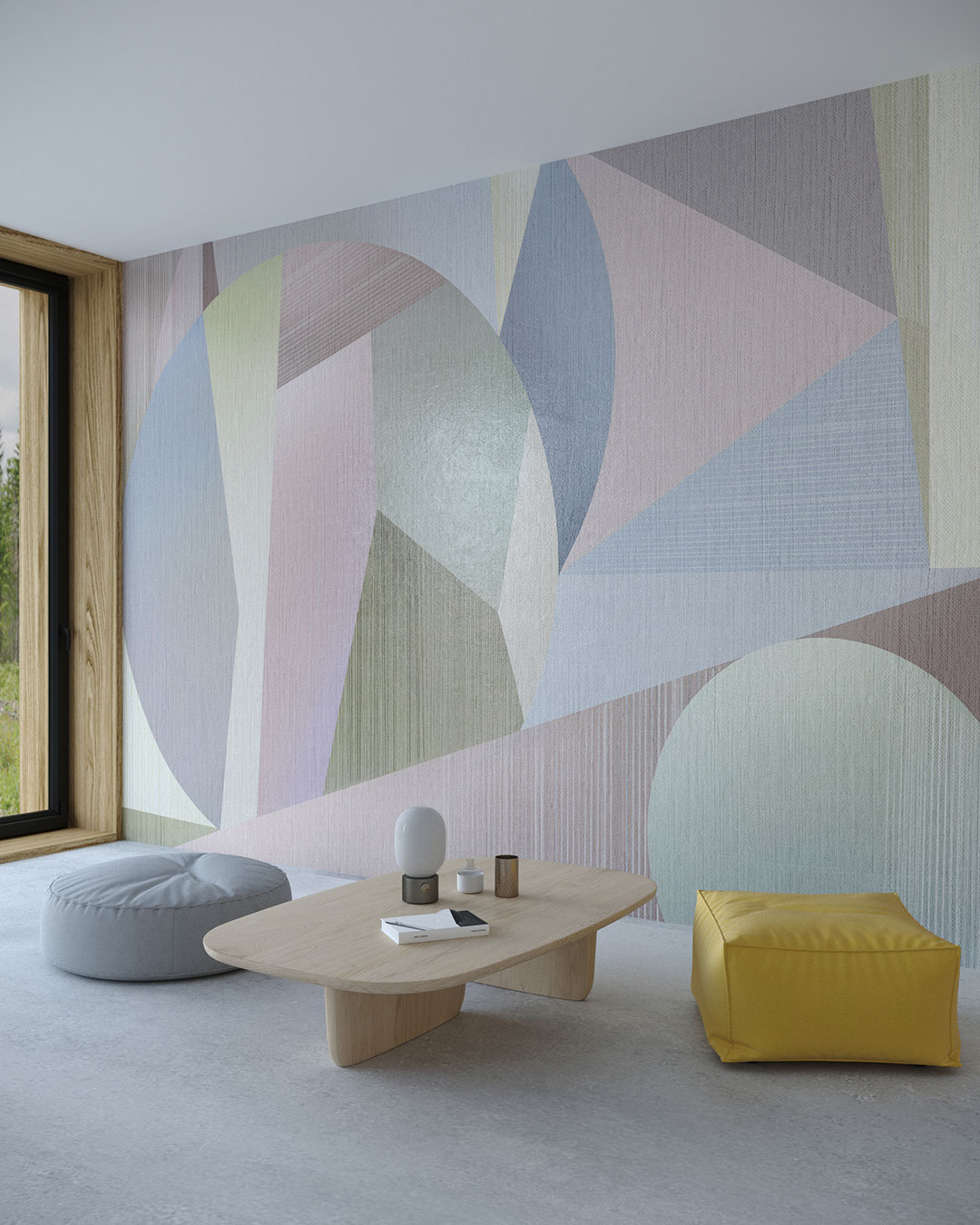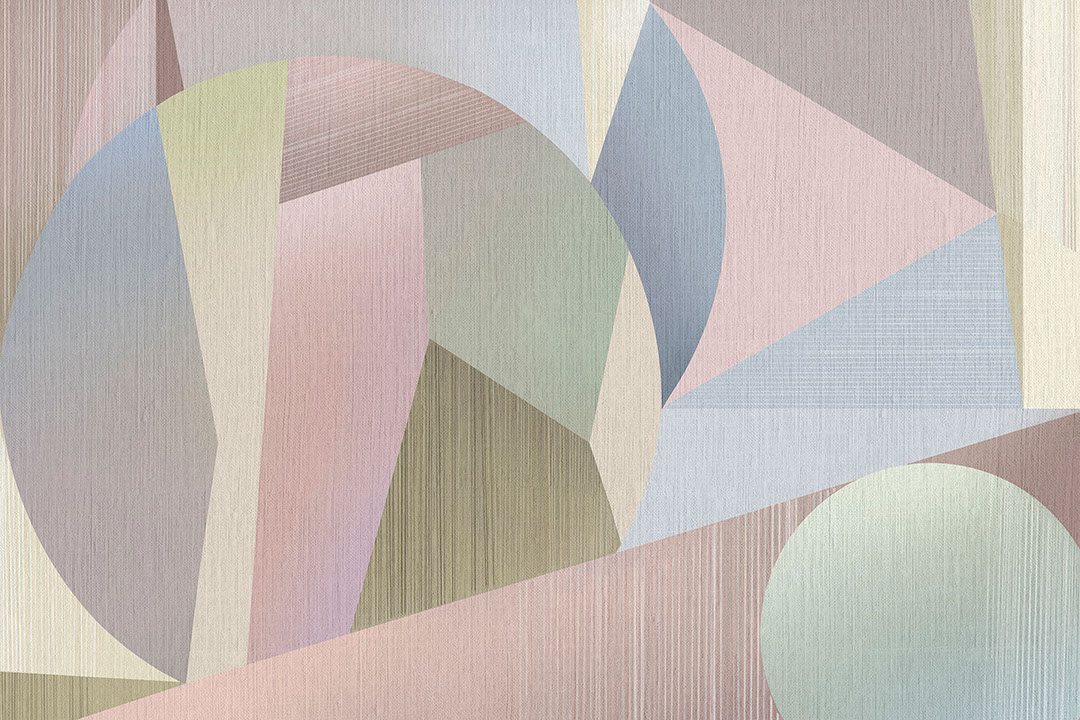 Prismara superpose disques, trapèzes et facettes en sauge douce, rose poudré, lilas brumeux et bleu nuage, le tout voilé d’un grain de lin. Des stries verticales ou obliques, semblables à la trame d’un tissu, adoucissent la géométrie d’inspiration Bauhaus. Associez Prismara à un chêne clair, du terrazzo et un canapé bouclé pour une élégance mid-century, ou laissez-la rafraîchir une chambre d’enfant avec rotin, laque blanche et plaids tricotés. Autour d’un coin petit-déjeuner, elle éclaire le café de l’aube ; le long d’un mur d’atelier, elle devient toile de fond stimulante pour les idées.