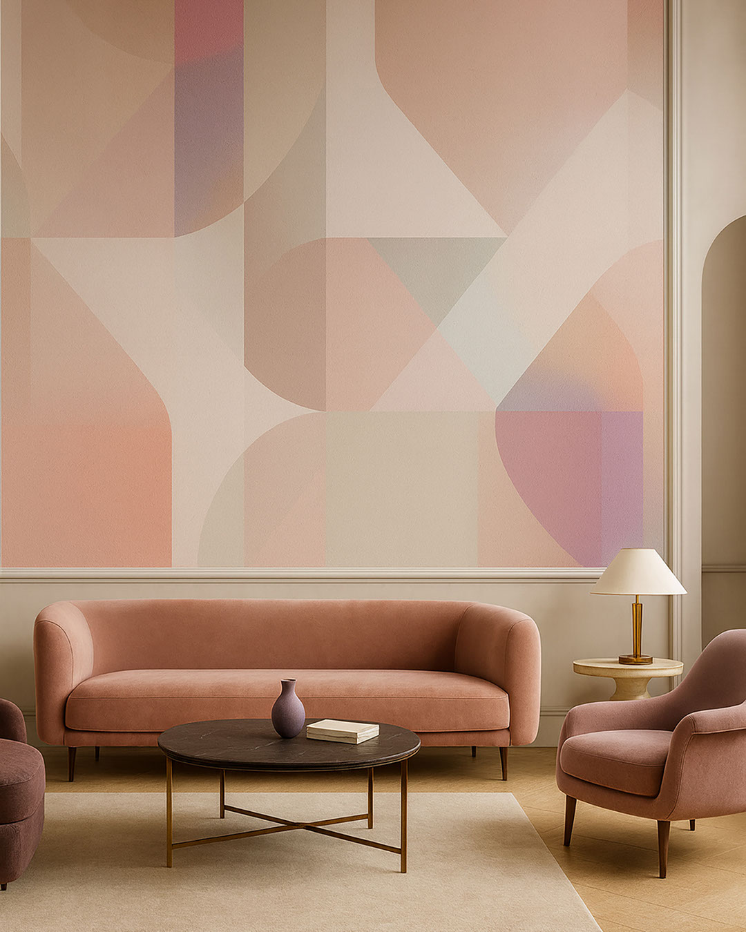 Papier peint formes géométriques abstraites dans une chaleureuse palette rose pastel