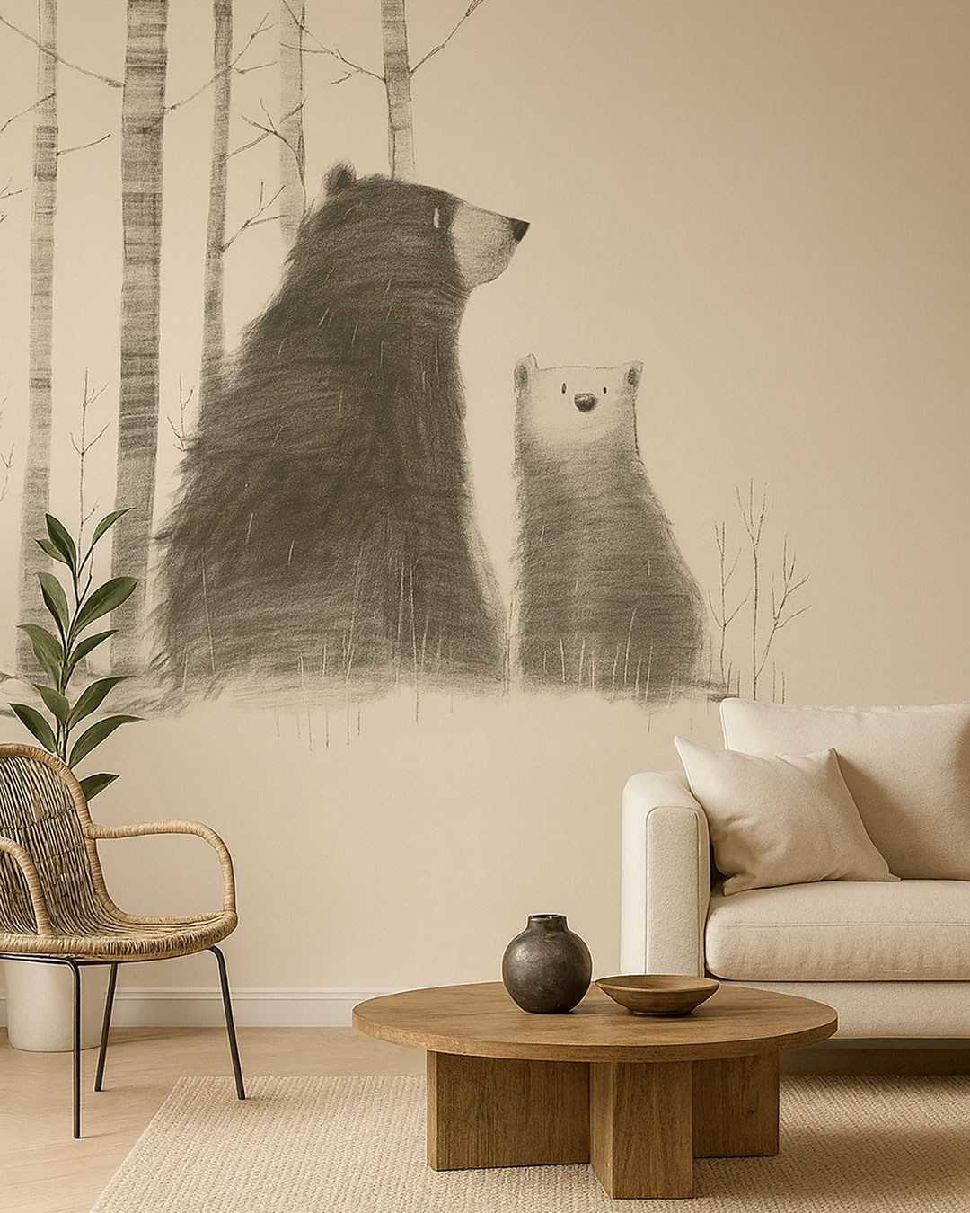 Ursina représente un grand et un petit ours assis paisiblement parmi de fines bouleaux et raconte une douce histoire de soin et de confiance. Le dessin monochrome tout en douceur rappelle un croquis au crayon et apporte chaleur et sécurité à la pièce. Le fond clair et discret garde l’espace léger et s’adapte facilement à de nombreux styles d’intérieur. Ce papier peint est idéal pour les chambres d’enfants, les nurseries, les coins lecture en famille ou les petites zones de détente. Associée à des meubles en bois, des textiles aux tons naturels et des accessoires inspirés de la forêt, Ursina crée un univers tendre pour les jeux calmes, le repos et les histoires du soir.